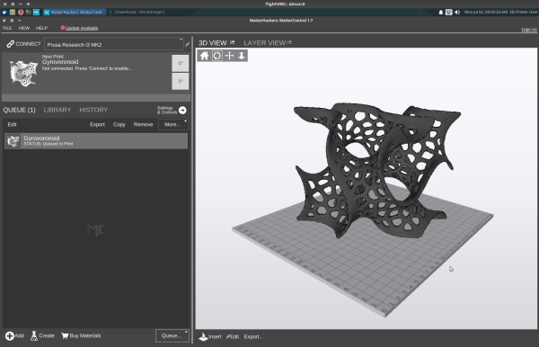 There's lots of different software that you can use to communicate with printers, but the particular software used here is called MatterControl. We're using an older version of this particular software because it's one of only two software solutions that will communicate with the Makerbot Replicator 2, and the only software that will communicate with both the Makerbot and the Prusa i2mk3s.