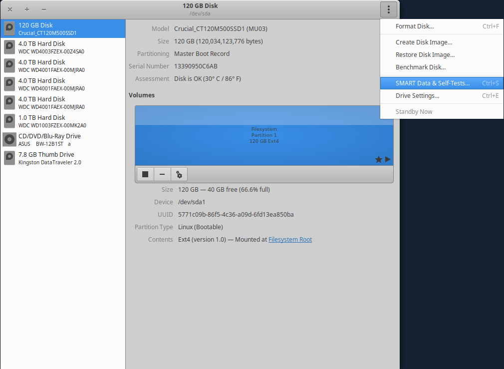 Open “SMART Data & Self-Tests”, click “Start Self-Test”, and select a test to run.