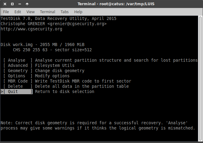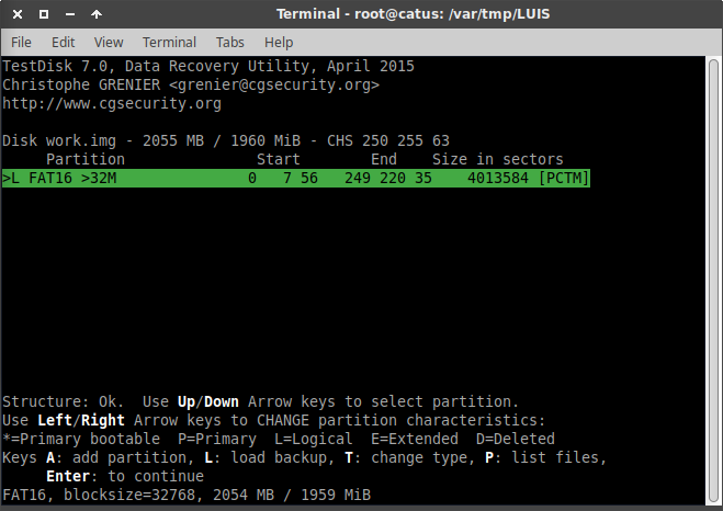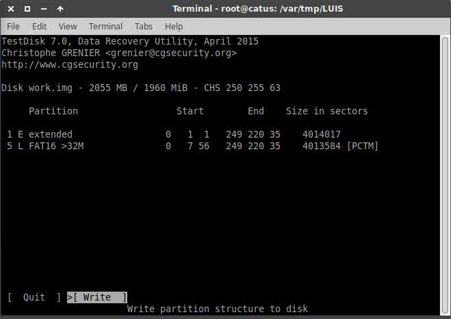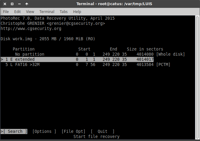 fdisk -lu work.img Disk work.img: 1.9 GiB, 2055208960 bytes, 4014080 sectors Units: sectors of 1 * 512 = 512 bytes Sector size (logical/physical): 512 bytes / 512 bytes I/O size (minimum/optimal): 512 bytes / 512 bytes Disklabel type: dos Disk identifier: 0x00000000 Device Boot Start End Sectors Size Id Type work.img1 63 4014079 4014017 1.9G 5 Extended work.img5 496 4014079 4013584 1.9G 6 FAT16