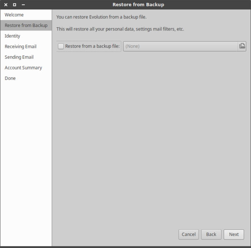 2. Next you will be prompted to restore Evolution's settings from a backup file.