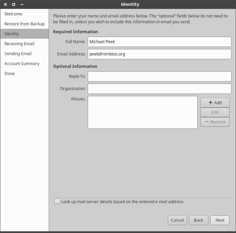 1. When you first run Evolution an email account setup window will appear, titled “Welcome”.