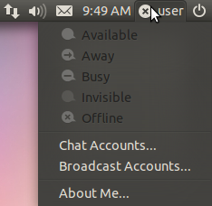 This indicator shows you the username of whoever's logged in on a particular machine. (Presumably this will be you most of the time.) Clicking on this icon brings up a menu of social settings that work with other Ubuntu social networking programs, such as Pidgin