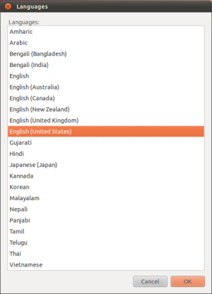 To select a different language, click on this pop-up menu. If your language is listed, you may select it from the pop-up list. Otherwise, click “Other…” to receive a more comprehensive list of available languages: