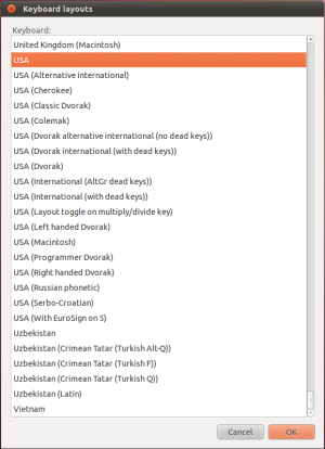 To select a custom keyboard layout, click on this pop-up menu. If your desired layout is listed, you may select it from the pop-up list. Otherwise, click “Other…” to receive a more comprehensive list of available keyboard layouts: