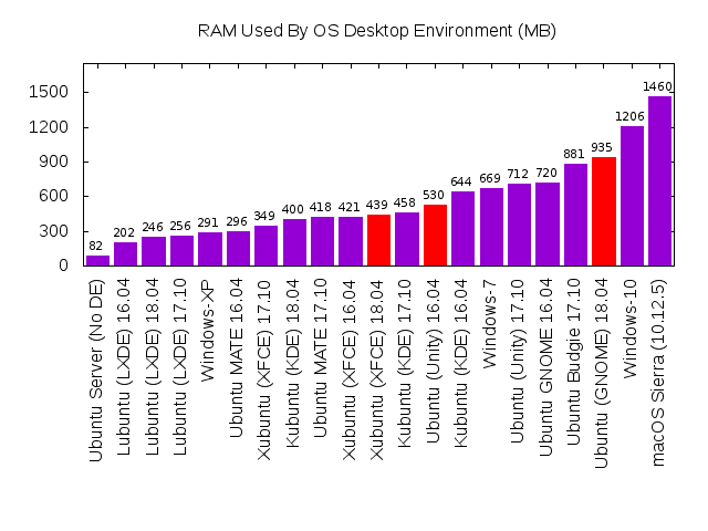 In this transition, Canonical decided to stop spending effort on developing and maintaining a desktop environment when there were already many nice desktop environments already available to choose from. Before their foray into Unity, Ubuntu ran on top of the Gnome desktop. So when they retired Unity, Ubuntu returned to Gnome. But… Gnome has some downsides that I personally don't like. Take a peek at this chart, specifically at the values highlighted in red: